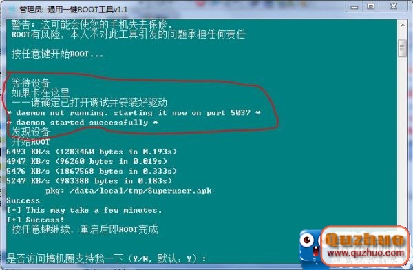 然後等待完成,再提示按任意鍵手機重啟的時候,按任意鍵,等待手機重啟完就root成功了。