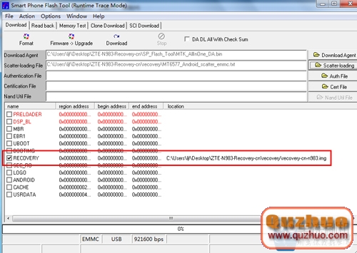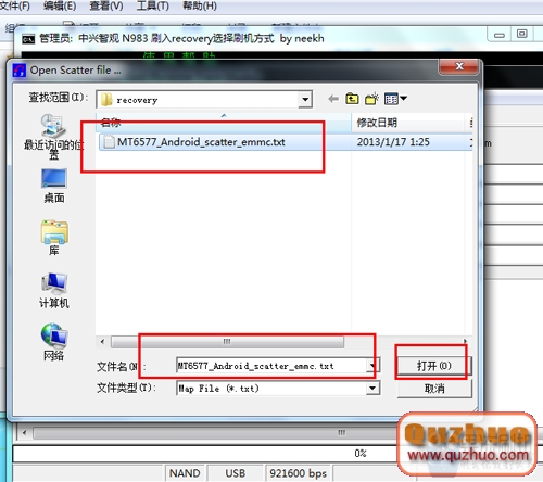 5:接著點擊Scatter-loading按鈕,選擇剛才解壓出來的文件夾裡的recovery文件中的MT6577_Android_scatter_emmc.txt文件;