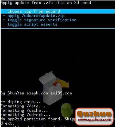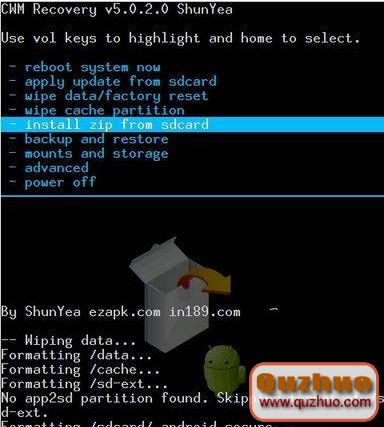 b)然後選擇 “choose zip from sdcard”(中文版:選擇從SD卡升級包更新),按小房子鍵確認。