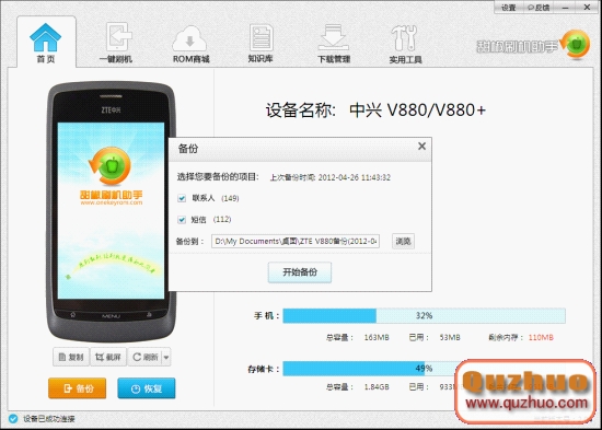 此時軟件會自動下載並安裝驅動,中興的驅動比較復雜,需按照電腦和軟件提示操作。連接成功後,軟件首頁會顯示手機當前基本信息。