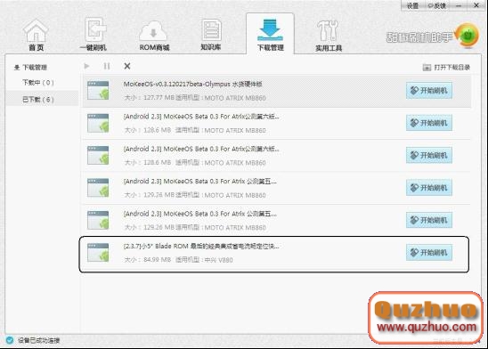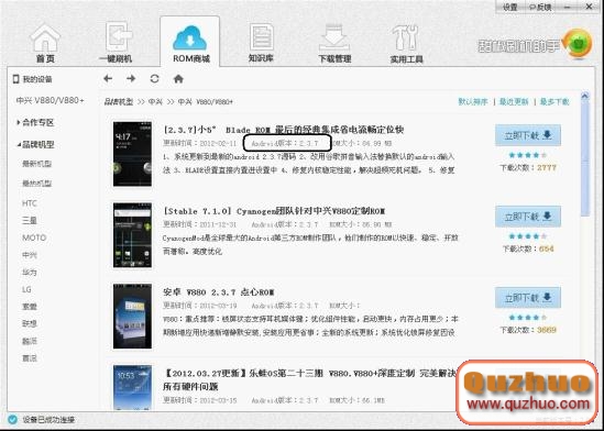 五、在進入ROM商城,軟件會直接顯示當前連接手機匹配的ROM資源,只需要選擇想要升級的ROM立即下載。這裡會顯示每個ROM版本、大小、更新時間,點擊ROM標題,還可以看到ROM特性和詳細截圖。