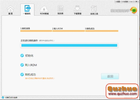 七、開始進入刷機流程,該過程需要等待約10分鐘左右,刷機過程中,千萬不要拔出手機。注意刷機結束後,手機端流程還會繼續進行,千萬不能動手腳,直到手機自動重啟。