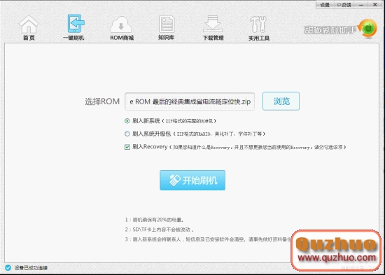 六、選擇ROM並下載後,可以進入下載管理查看下載進度。下載完成,可以直接刷機。點擊開始刷機,會進入一鍵刷機界面,如果你知道什麼是Recovery,並不想更換自己的Recovery,就把默認刷入Recovery選項取消。軟件默認幫你選擇刷入甜椒刷機助手的中文Recovery。
