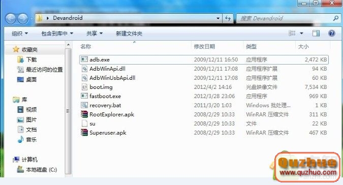 解壓到桌面,最好是WIN7系統。樣式為:Devandroid點進去後看得到一大堆文件,裡面包含了我們要用的adb,adb接口dll文件兩個,我們要用到的boot.img鏡像,fastboot.exe,RootExplorer.apk,su,Superuser.apk。內含文件如下圖。