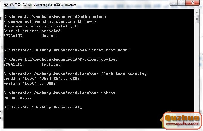 1)在第三步操作好的窗口中輸入adb devices,如果能看到list of devices attached下面有設備說明,你前面三步成功了,失敗重新繼續。然後我們要開始准備進入bootloader模式,也就是fastboot模式,原因是我們要通過fastboot刷入boot.img替換;