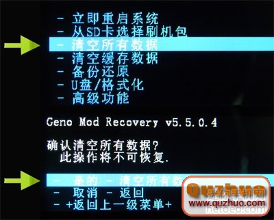 按音量鍵選擇 清空所有數據——是的——清空所有數據