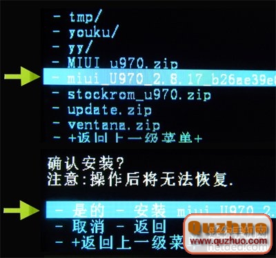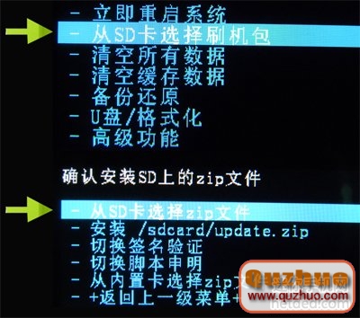 4:選擇“從SD卡選擇刷機包”,然後再選“從SD卡選擇ZIP文件”,然後再找到剛下載的zip刷機包,然後按電源鍵並確認