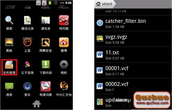 2、通過手機的文件管理器看到SD卡中的文件是否正常。點擊“文件管理器-->sdcard-->update.zip”