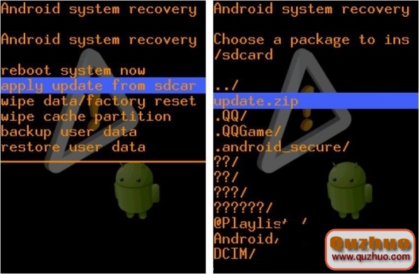 3、進入t卡目錄後選擇你下載的升級包update.zip。選擇update.zip按menu鍵開始升級。