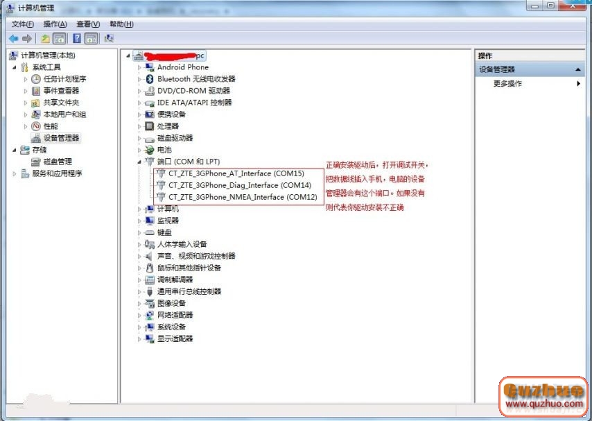 驗證驅動安裝是否成功方法: 連接計算機後,右鍵單擊“計算機”選擇“管理”,點擊“設備管理器”,展開“端口” 會看到三個端口顯示: