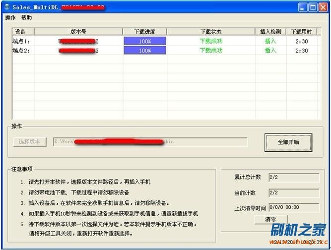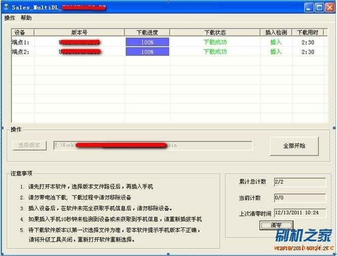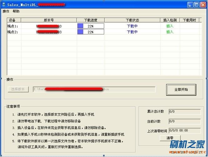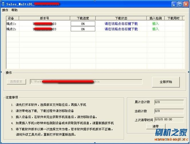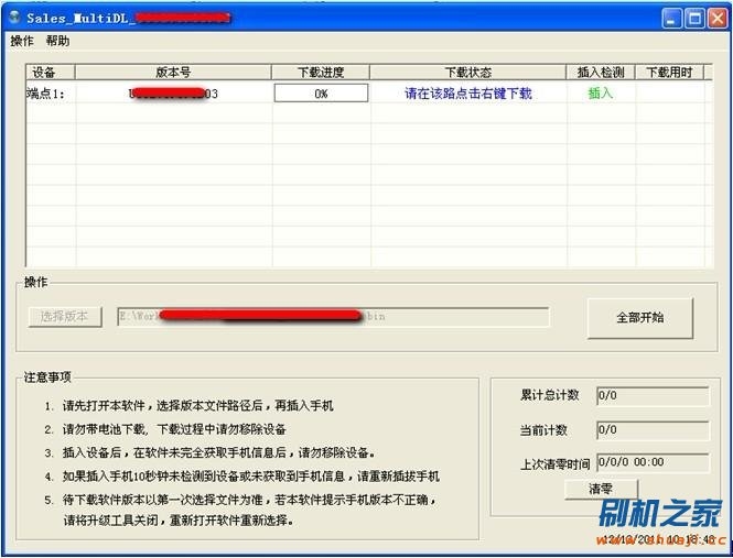 以此類推:待下載工具界面上顯示第二只手機的“版本號”和“點擊右鍵下載”後,再插入第三只手機; 如此往復至插入第八只手機。(勿一次性連續插入8只手機)