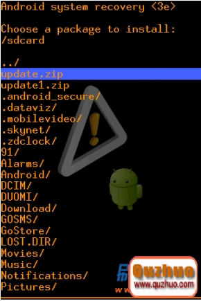 7:然後在出現的列表中選擇“update.zip”文件,然後按開機鍵進行確認,之後就開始刷機了