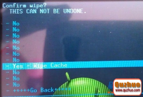 3:進入recovery界面之後先進行雙清,(按音量鍵表示選擇,按開機鍵表示確認),依次執行