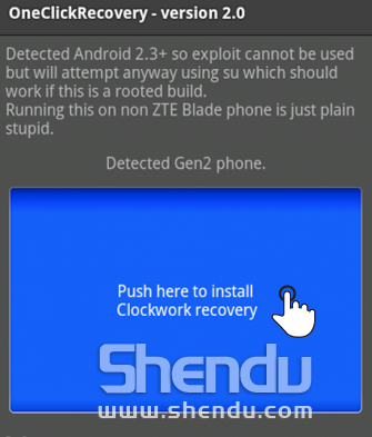 在手機上打開 OneClickRecovery,點擊“Pushhere to install Clockwork recovery”按鈕(如圖)以安裝Recovery,手機將會自動關機進入recovery模式。