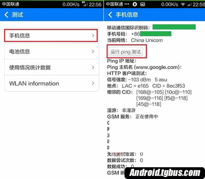 在安卓手機撥號界面輸入:*#*#4636#*#* 完成後,手機會進入Android工具測試界面,然後點擊「手機信息」,之後再點擊「運行ping測試」如下圖。