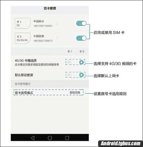 一、首先打開【設置】,點擊【雙卡管理】或【國際漫游設置】,根據實際需要,分別對兩張 SIM 卡進行設置,如圖所示:
