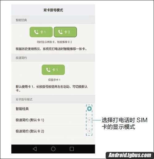 二、點擊【雙卡撥號模式】,可設置撥打電話時顯示兩張 SIM 卡或僅顯示一張默認 SIM 卡。如果設定了默認卡,手機將優先使用默認卡撥打電話,如圖所示: