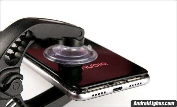 三、nubia Z11 mini玻璃後殼采用卡扣式和雙面膠固定在金屬邊框上,因此這裡需要借助吸盤來掀開背面蓋板,如圖所示。