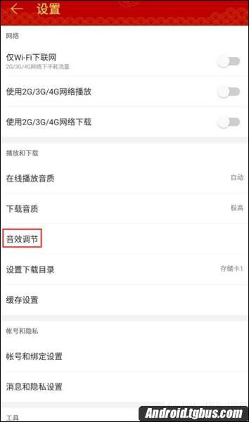 一、為了聽到無損音樂並方便調節我們使用網易雲音樂作為試音平台,在網易雲音樂APP設置界面選擇【音效調節】選項,如圖所示: