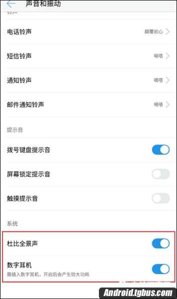 五、最後需要提示的是:杜比全景聲和數字耳機選項需要打開!在系統【聲音與振動】裡面開啟杜比全景聲和數字耳機兩個選項開關,如圖所示: