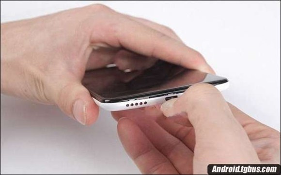 第二步:360手機N4的後蓋是通過卡扣方式固定的,可以直接徒手打開。在這裡小編教大家一個小竅門:從360手機N4底部USB接口位置的缺口處用力一掰,可以比較輕松的撬開一個縫隙,如圖所示。