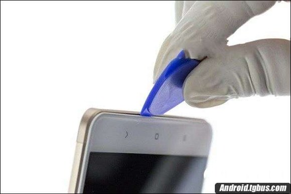 第二步:取出卡托後,然後先用吸盤從手機屏幕一側用力吸開一條縫,再用撬片面縫隙進入,左右滑動;劃開一側後,再小心劃開兩側側,分離後蓋,如圖所示。