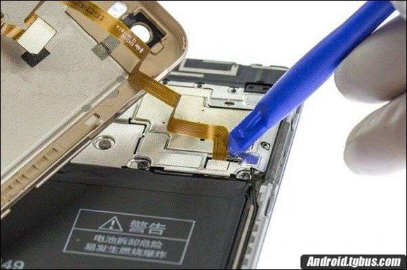 第三步:分離後蓋的時候,需要特別注意,後蓋中的指紋識別模塊與主板之間有排線連接,因此分離後蓋需要特別小心,切記不要用力拉開後蓋,以免扯斷排線。正確的做法是,先斷開指紋識別模塊與主板之間的排線,然後即可成功分離後蓋,如下圖所示。