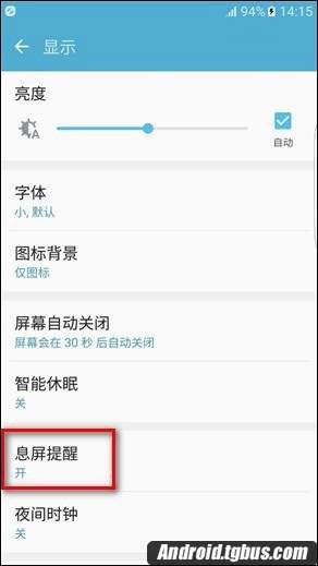 二、然後在設置的【顯示】中找到【息屏提醒】,默認是開啟狀態,如圖所示: