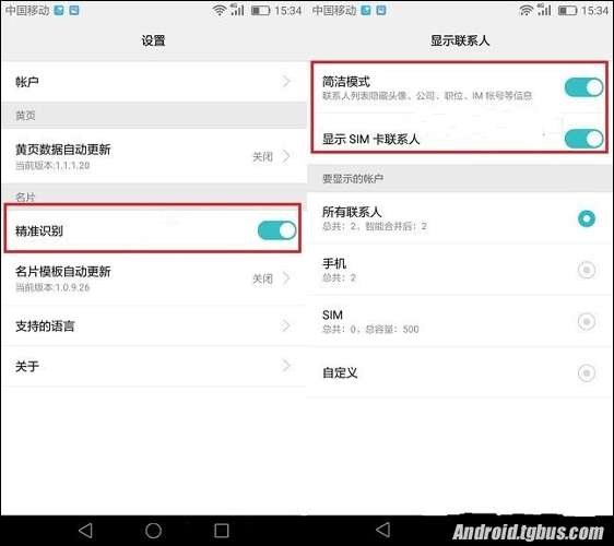 三、最後,點擊聯系人設置,選擇【精准識別】,簡潔模式,顯示SIM聯系人,可以最好的顯示手機聯系人,如圖所示: