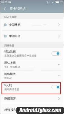 3、最後我們會在雙卡和網絡界面下方看到【VoLTE】選項,這個時候我們只需開啟的開關按鈕即可開通,如示意圖所示。