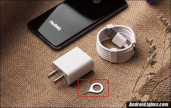 一、首先打開努比亞Z11 mini包裝盒,慢慢打開包裝盒裡的配件,我們會看到有一個【卡針】,如圖所示。