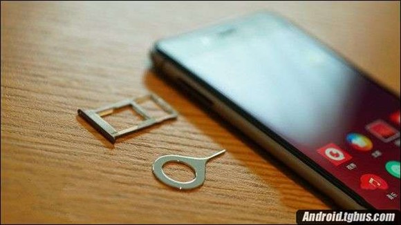二、然後使用卡針將手機1的卡槽取出,其卡槽設計在機身左側,將卡針垂直插入努比亞Z11 mini機身側面的卡槽空,稍微用力一頂,就可以彈出卡槽了,如下圖所示: