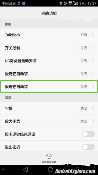 二、開啟盲人模式以後,我們退回到輔助功能,任意點擊手機屏幕功能處,比如【愛奇藝自動裝】,它就會語音讀出,雙擊即可進入開啟此功能,如圖所示: