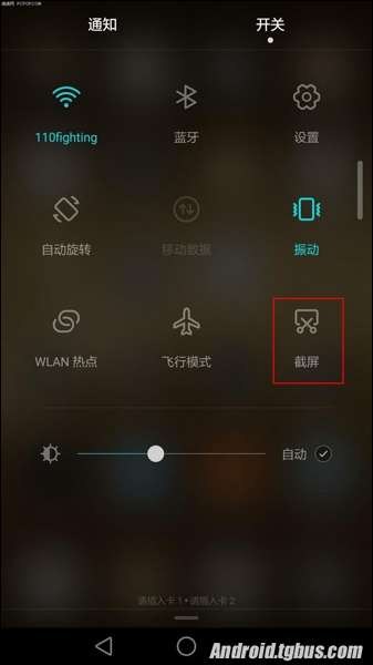 打開華為P9需要截屏的界面,然後用手指屏幕向下滑動調出通知欄下拉屏幕,然後切換到【開關】選項,點擊下方的【截屏】即可快速截圖,如下圖所示。