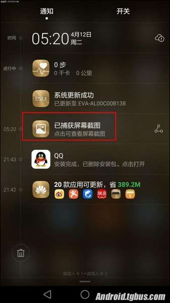 截屏之後我們便可在通知消息欄看到截屏成功的消息,如圖所示。