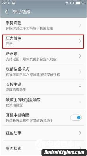 二、點擊進入到“輔助功能”設置頁面中,就可以找到壓力觸控功能了,此外下面還可以調節3D Press觸控的靈敏度,如圖所示。