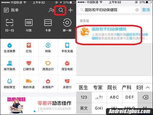 1.打開支付寶,點擊右上角的搜索圖標,在搜索欄輸入國際和平婦幼保健院服務窗,如圖: