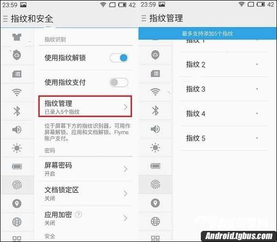 三、最後添加完指紋後,我們可以選擇開啟指紋屏幕解鎖、指紋支付、指紋應用和文檔解鎖等功能。一樣的,魅藍note3最多可以支持錄入5組指紋,手指是沒有什麼講究的,我們也可以將加入或朋友的指紋錄入,此外我們還能夠進行對指紋進行添加或刪除方面的管理,如下圖所示: