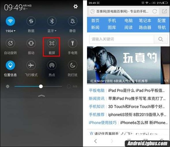 除了以上第一種使用實體組合快捷鍵截圖方法外,360手機F4系統的頂部下拉菜單中,還內置有截屏快捷操作選項,具體方法如下。