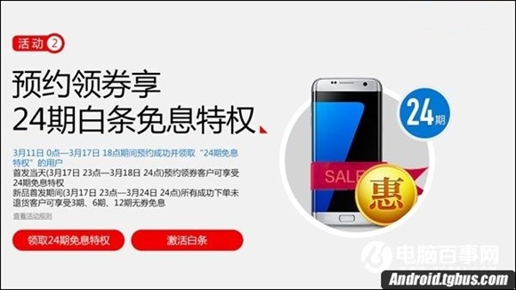 京東商城的最大優勢就是支持24期免息分期購買。雖然領取特權的門檻較低,僅需要在3月17日18點之前參加預約,並且在18日開賣當天購買即可享受24期免息分期購買。不過這項活動只針對開通京東白條的用戶,並且需要白條的可用額度高於手機的售價(至少需要4888元),因此門檻很高,一般用戶是無法享受這一福利。不過,你可以趁現在注冊一下,也許明年三星S8出了就能買了。另外,發售當天在京東商城購買三星S7/S7 edge還可以獲得得尊享大禮包。