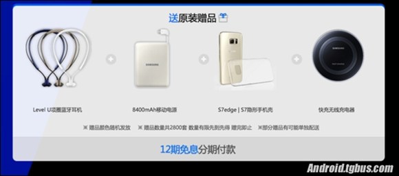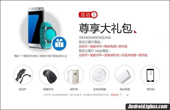 3月18日0點——24日24點期間購買三星S7獲得贈品有:自拍桿、智能手環、移動電源、意外險。購買S7 edge獲得贈品有:自拍桿、智能手環、原裝保護殼、無線充電器、意外險。