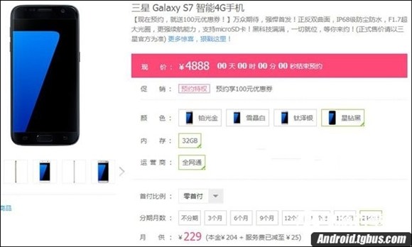 三星S7現國行在蘇寧易購裸機售價為4888元,三星S7 edge售價為5688元。蘇寧易購分期付款支持招商銀行、光大銀行和工商銀行以及廣發銀行,各銀行分期費率各不相同。