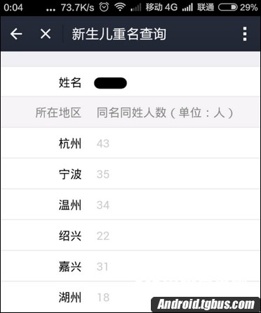 5、查詢完畢,系統提示你在全省各地同名的人數量,以便我們取名的時候參考。