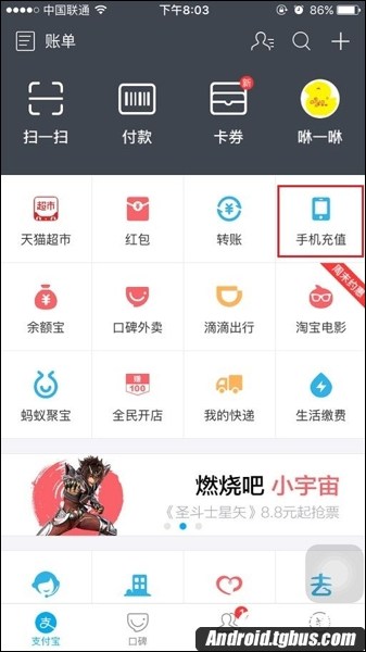 一、首先在手機中打開並登陸支付寶,然後在主界面找到並點擊進入 手機充值,如圖所示。