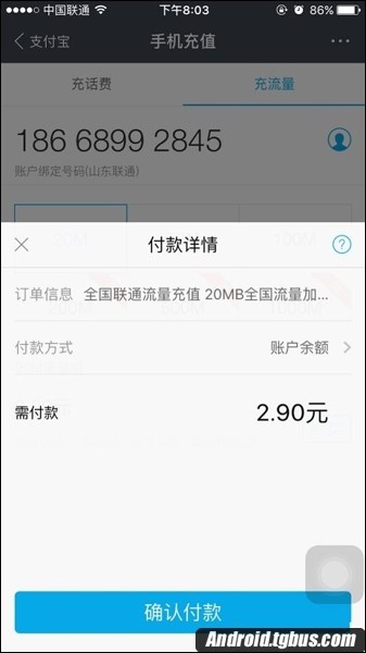三、在充值流量界面,一般有20M、50M、100M、200M、500M、1000M等幾種套餐,價格分別為2.9元、5.7元、9.6元、15元、30元、46元幾種,只要選擇好自己需要的流量,然後點擊 購買,最後支付即可。