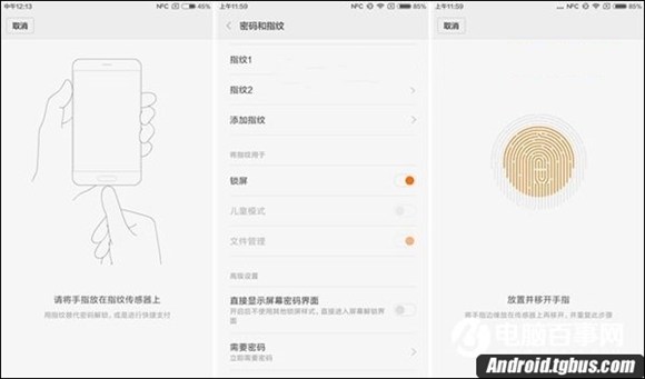 二、在設置頁面中,再點擊進入【鎖屏、密碼和指紋】界面,然後按系統提示設置好四位數字密碼之後,接下來就可以為紅米Note3添加指紋了。跟目前市面上絕大多數指紋手機一樣,添加指紋方法很簡單,只需按照提示來便可,每次指紋的錄入過程需要12次左右,如下圖所示。