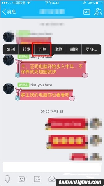 二、然後長按住成員的一條消息,選擇【回復】,如下圖所示: