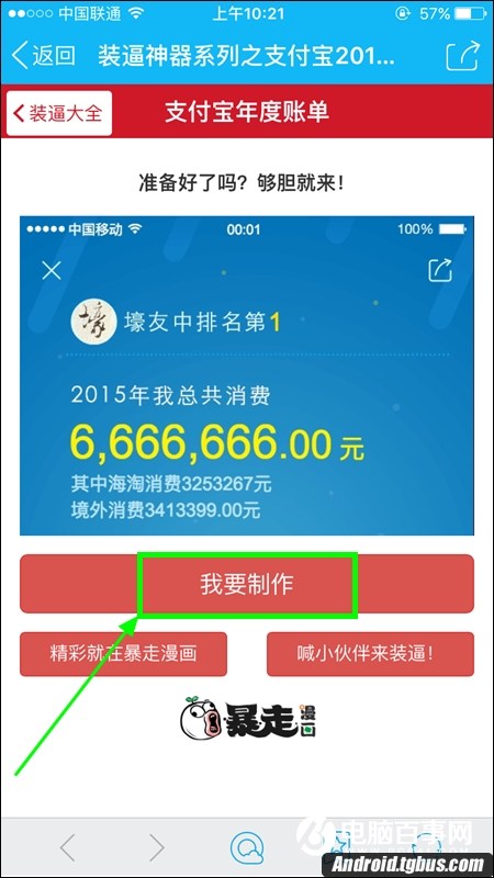 二、打開支付寶2015年度賬單在線制作工具後,使用非常簡單,開始點擊【我要制作】按鈕,進入到繪制頁面,如下圖所示: