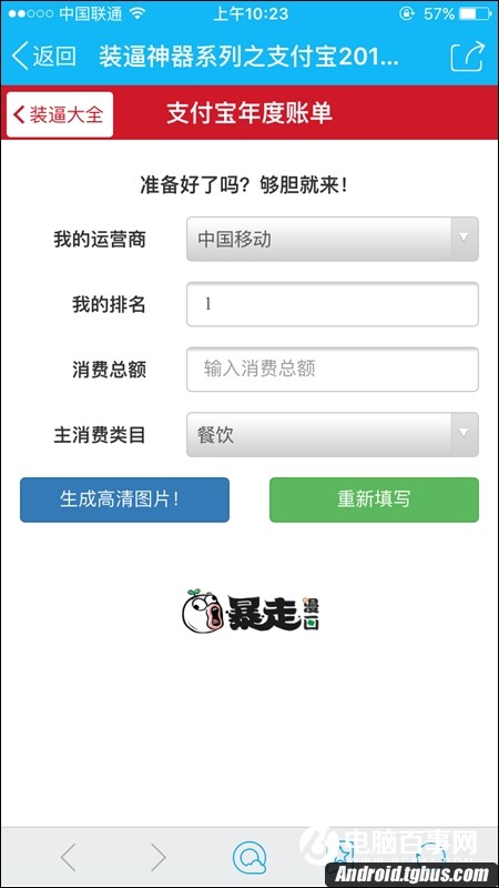 三、接下來只要選擇【我的運營商】,【我的排名】,【消費總額】(消費金額越多就越裝逼)以及【主消費類目】,完成後點擊下面的“生成高清圖片”,如下圖所示。
