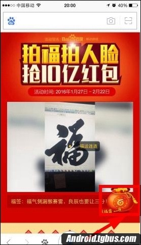 一年一度讓人期待的日子馬上就要來臨了,春節,對於億萬家庭來說都是團圓的日子,而為了回饋大家,支付寶、微信、還有百度也打響了紅包大戰。這次百度的紅包玩法還是很新穎的,可以拍福字搶紅包哦。那手機百度拍福字搶紅包怎麼玩呢?下面小編就來和大家分享下具體玩法教程。